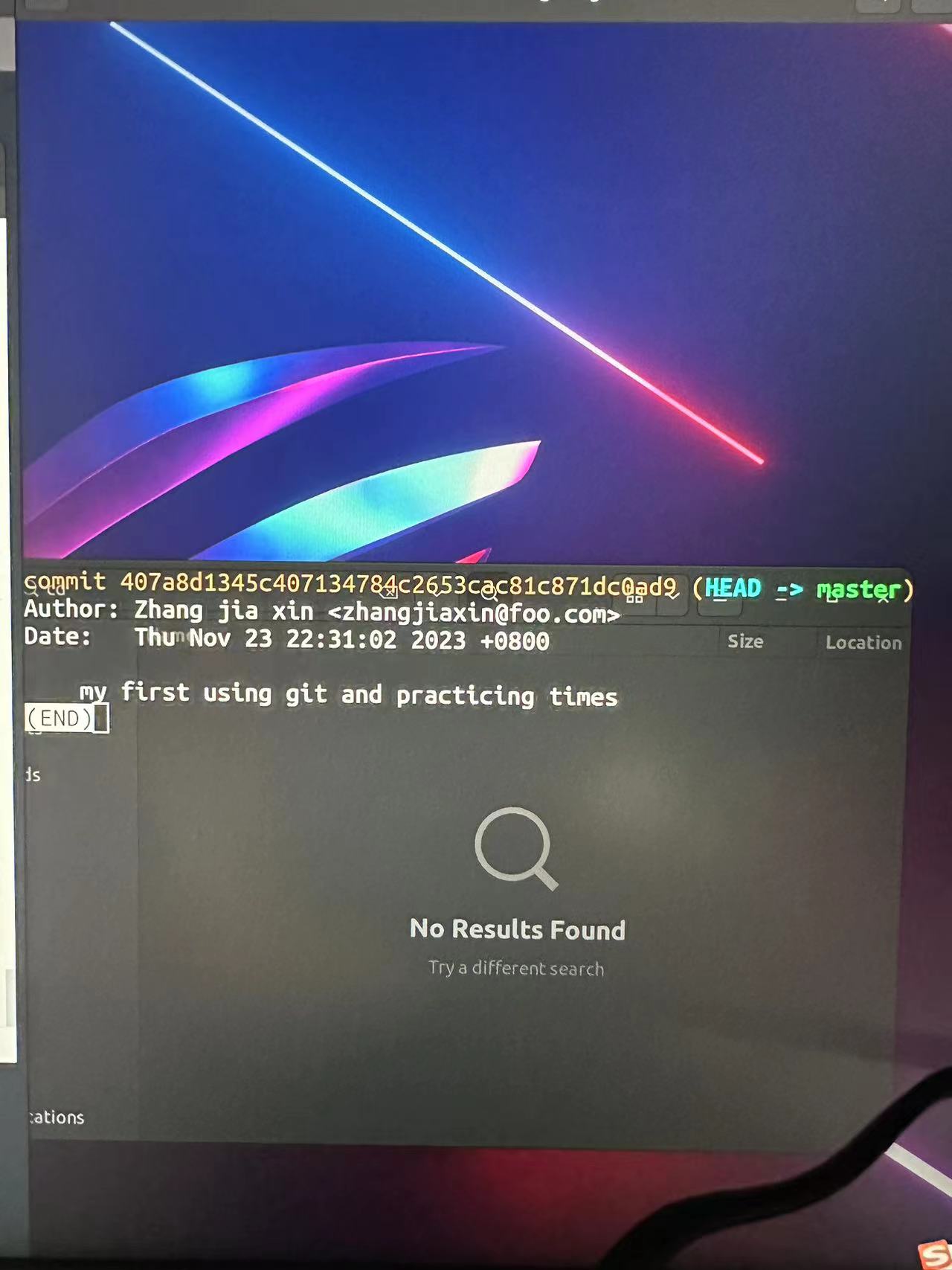 可以看出我有一个存档的记录在昨天晚上的22:31:02时刻,标题为“my first using git and practicing times”,因为是第一次使用,所有把它简单的存为练习题目。第一次使用这个命令,内容应该为空。