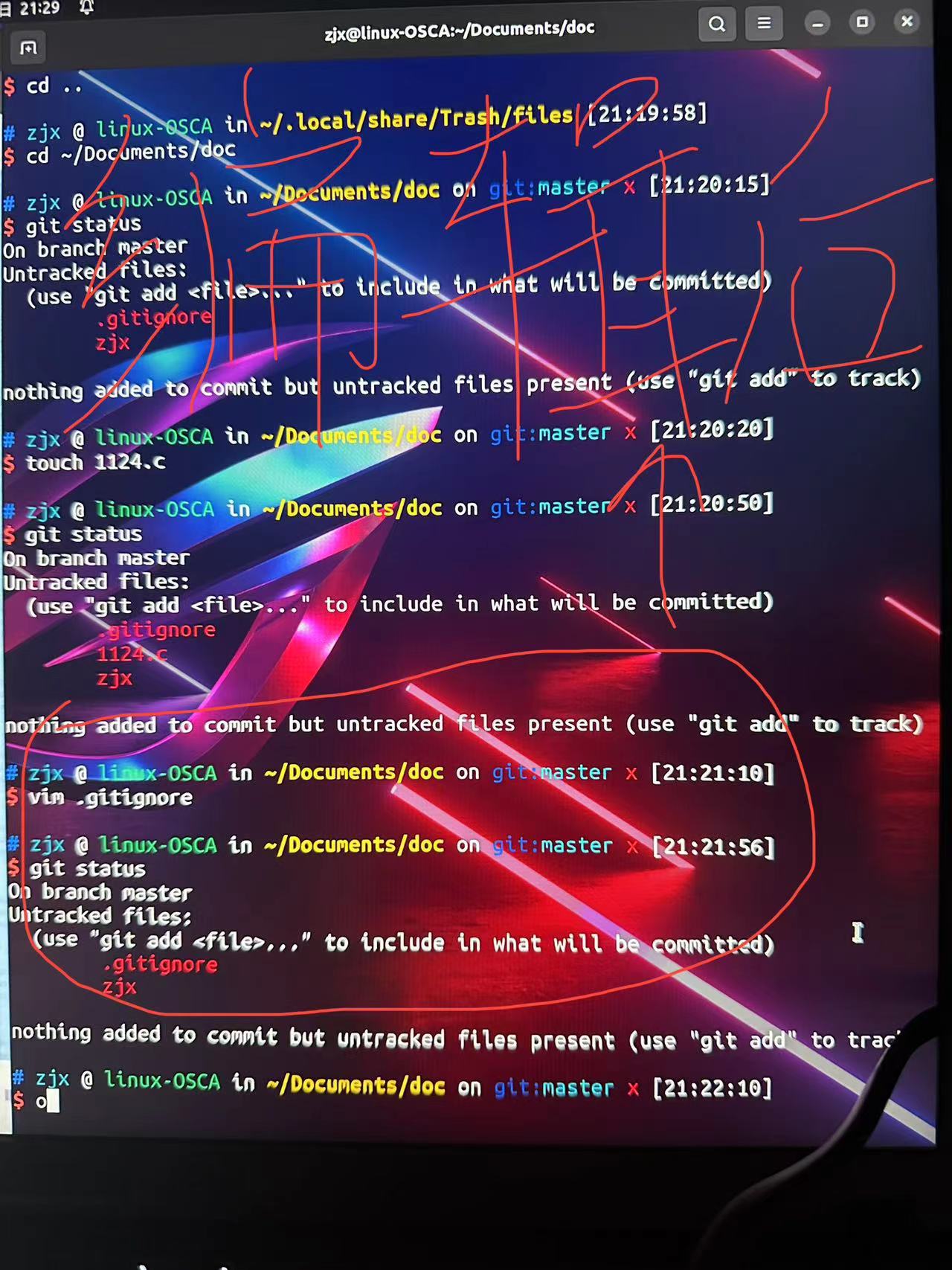 可以看出我把名为1124.c的文件写入了其中,接下来就是见证.gitignore的效果的时刻: