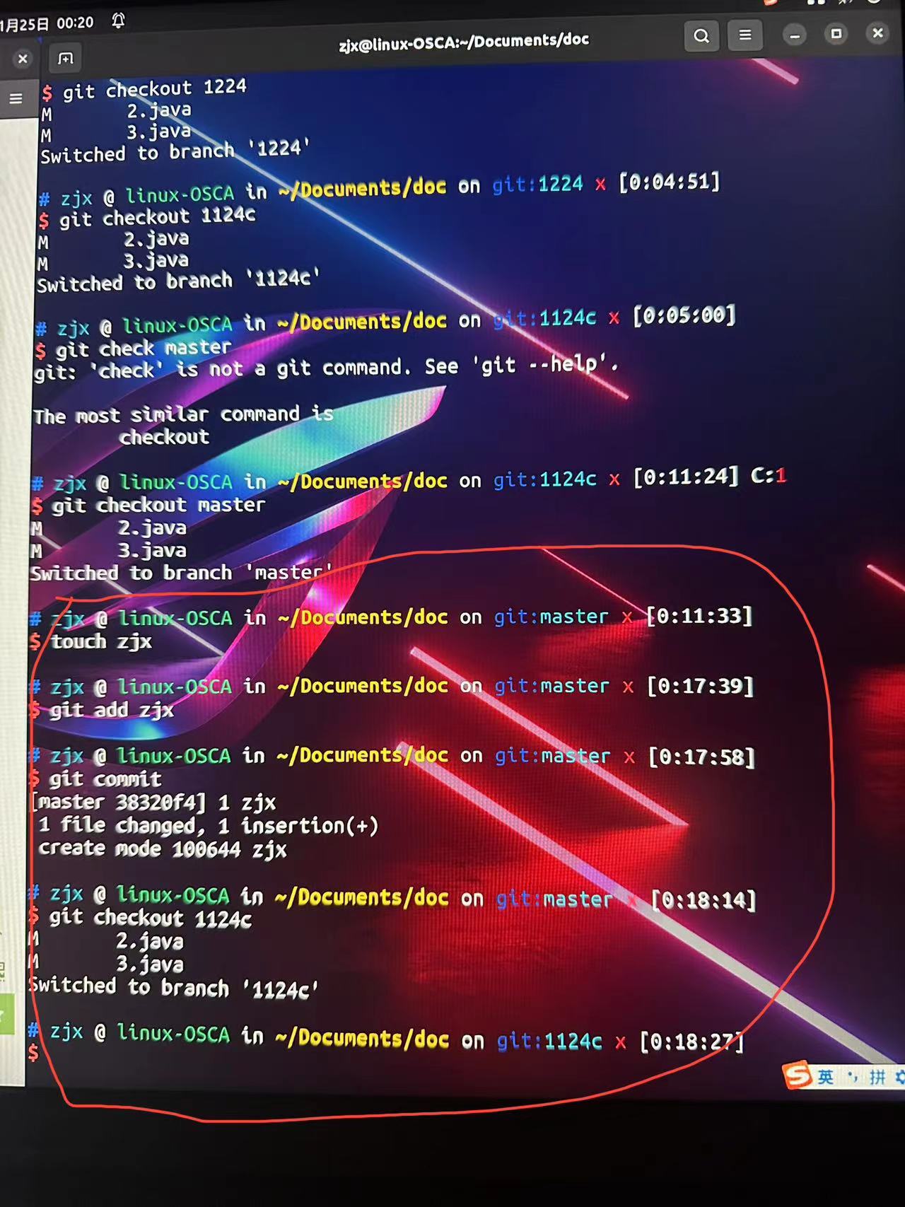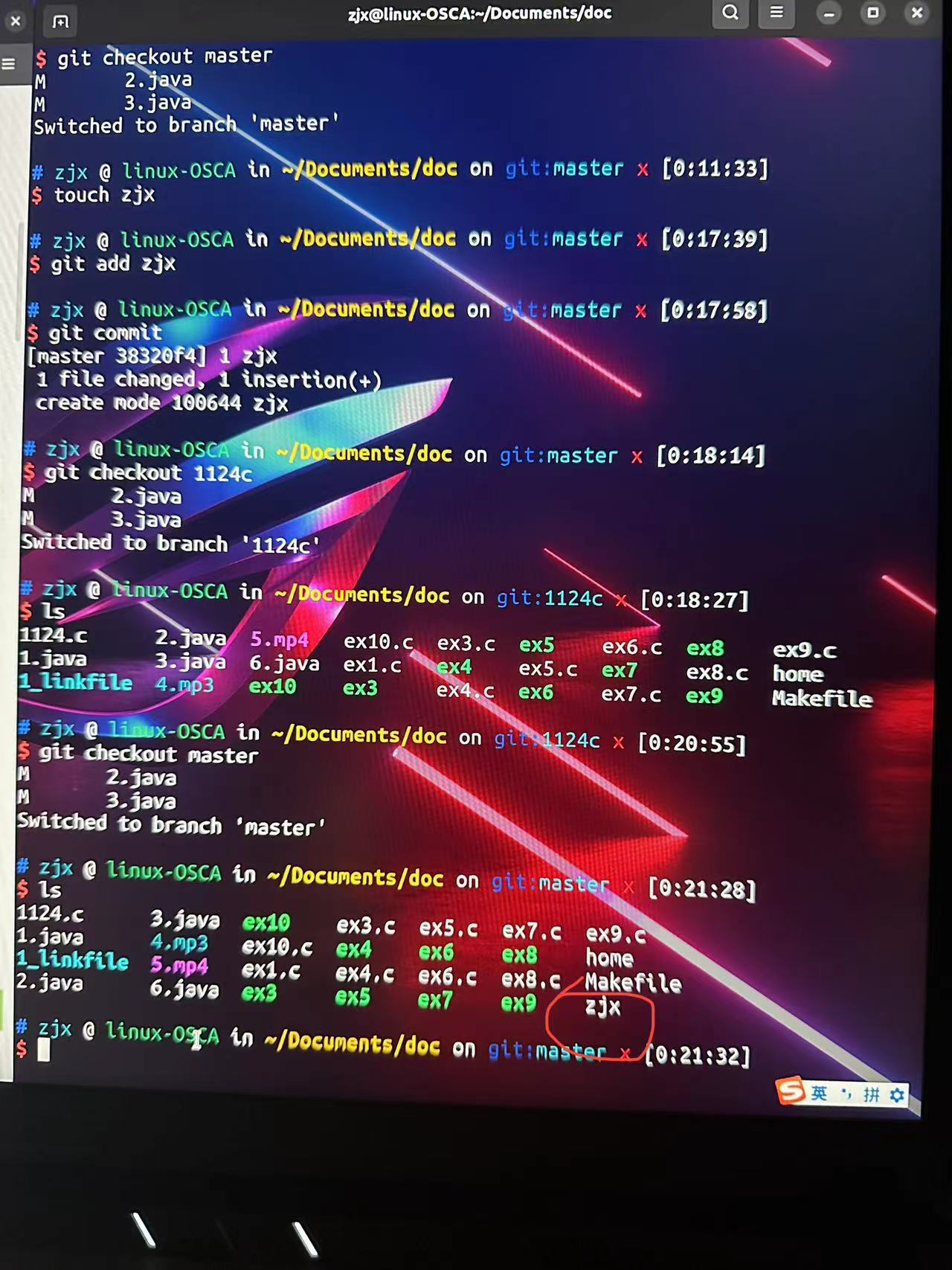 2.然后我在这个虚构分支中,再找一个文件进行内容修改,我在zjx空文件中写入zjx666并保存,这个保存是跟存档一样的,需要输入命令(这个十分重要,一开始我以为只要在不同的分支里进行修改,这些修改就会是相互独立的,实际却不是,它是共享修改结果的,为这个问题我想了很久很久,所以需要十分注意,一定要将各个分支的修改分别进行新的存档 存档 存储):