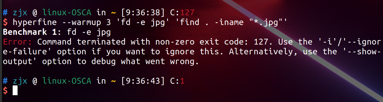 $ hyperfine --warmup 3 'fd -e jpg' 'find . -iname "*.jpg"'